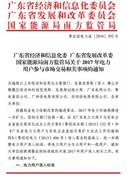 2016年11月28日,廣東省發(fā)布《關于2017年電力用戶參與市場交易相關事項的通知》。此后廣東省又發(fā)布了《關于2017年用戶準入及交易結算的補充說明》、《關于支持有色金屬企業(yè)參與電力直接交易的通知》、《廣東省經濟和信息化委關于電力用戶參與直接交易相關事項的通知》,來明確電力用戶參與直接交易的準入標準。