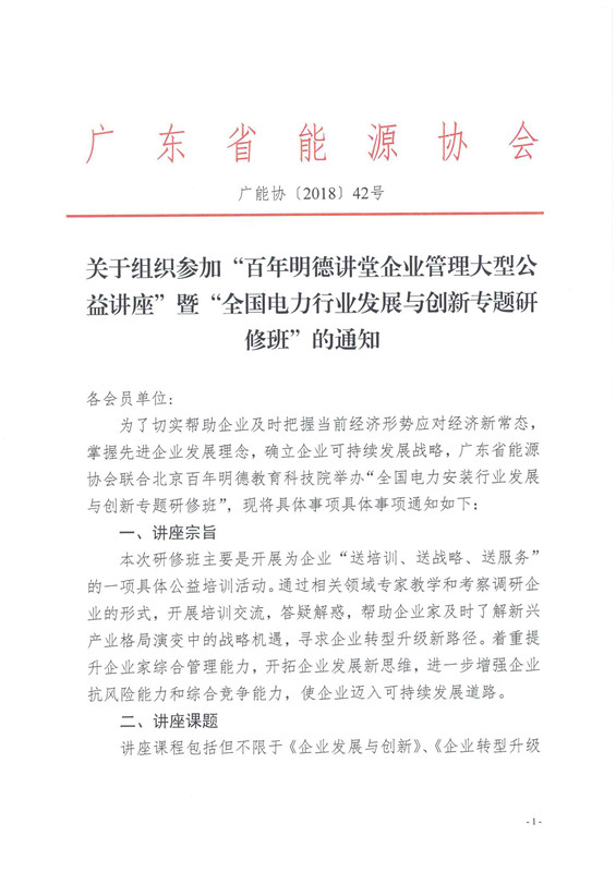 關(guān)于組織參加“百年明德講堂企業(yè)管理大型公益講座”暨“全國(guó)電力行業(yè)發(fā)展與創(chuàng)新專題研修班”的通知